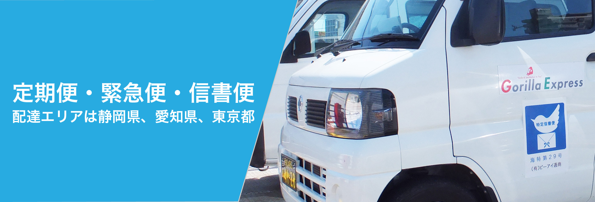 配達エリアは静岡県、愛知県、東京都。書類や荷物を中⼼に取り扱う運送サービスです。